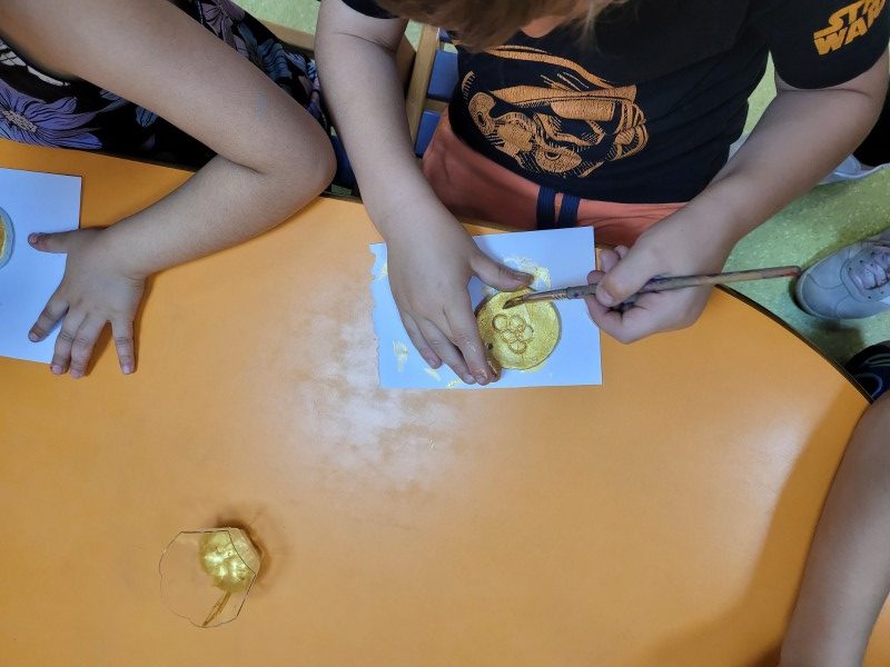 Τα παιδιά συμμετείχαν σε διάφορα αγωνίσματα: άλμα σε μήκος, δρόμους με εμπόδια ακόντιο. σφαίρα, σκυταλοδρομία, και τρέξιμο και κάθε άθλημα που γνωρίζαμε το παρακολουθήσαμε σε βίντεο Ολυμπιακών Αγώνων. Κατασκευάσαμε τα μετάλλια μας και τον Αρχαίο κότινο.