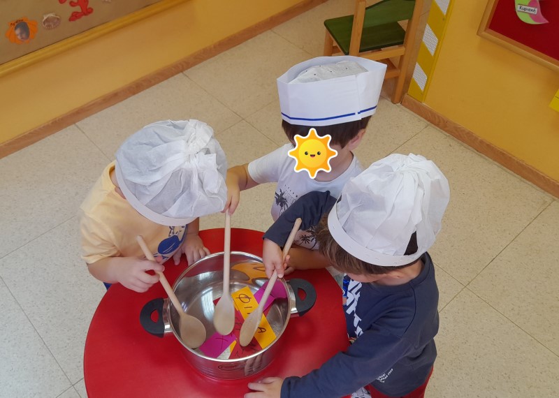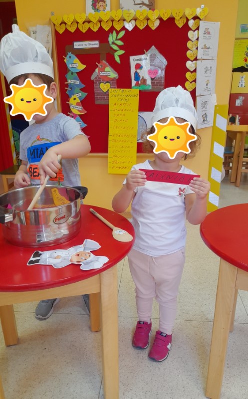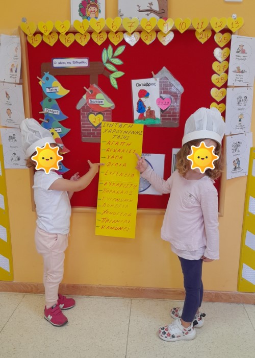 Μάθαμε τραγούδια , διασκεδάσαμε με μουσικοκινητικά παιχνίδια , διαβάσαμε ιστορίες , παίξαμε κουκλοθέατρο με πρωταγωνιστή τον κύριο Κανονούλη και… βρήκαμε τη συνταγή για να είμαστε όλοι χαμογελαστοί! Γράψαμε όλοι μαζί τα υλικά σε μαγικό χαρτί , γίναμε μικροί μάγειρες , ρίξαμε τα υλικά στην κατσαρόλα , τα ανακατέψαμε , τα μαγειρέψαμε και απολαύσαμε τη νοστιμιά της Χαρούμενης Τάξης μας!!!!!