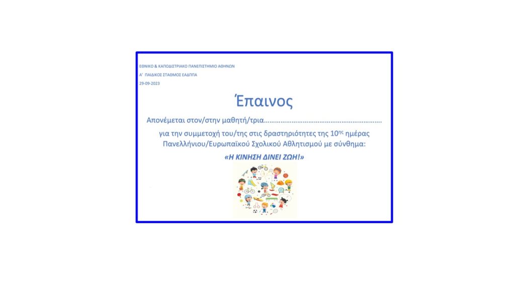 - Απονομή επαίνου για τη συμμετοχή στη «10η Πανελλήνια Ημέρα Σχολικού Αθλητισμού-Ευρωπαϊκή Ημέρα Σχολικού Αθλητισμού 2023.