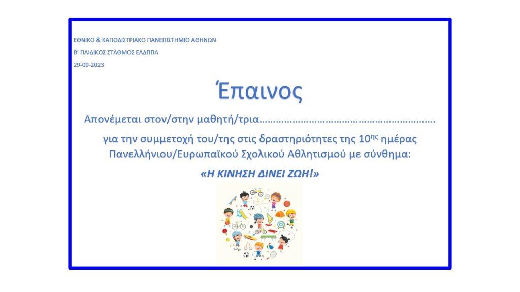 • Απονομή επαίνου για τη συμμετοχή στη «10η  Πανελλήνια Ημέρα Σχολικού Αθλητισμού-Ευρωπαϊκή Ημέρα Σχολικού Αθλητισμού 2023.